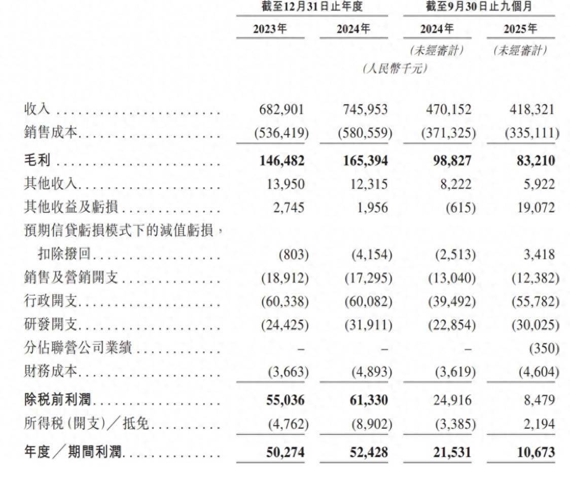 更值得警惕的是盈利才调的权贵滑坡。2023年全年,公司完了除税前利润5.50亿元,净利润5.03亿元。而到了2025年前九个月,除税前利润骤降至8479万元,净利润仅为1.07亿元。对比2024年同时的除税前利润2.49亿元与净利润2.15亿元,分歧暴跌约66%和50%。利润的缩水速率远超收入下滑幅度,突显其盈利质料正在恶化。