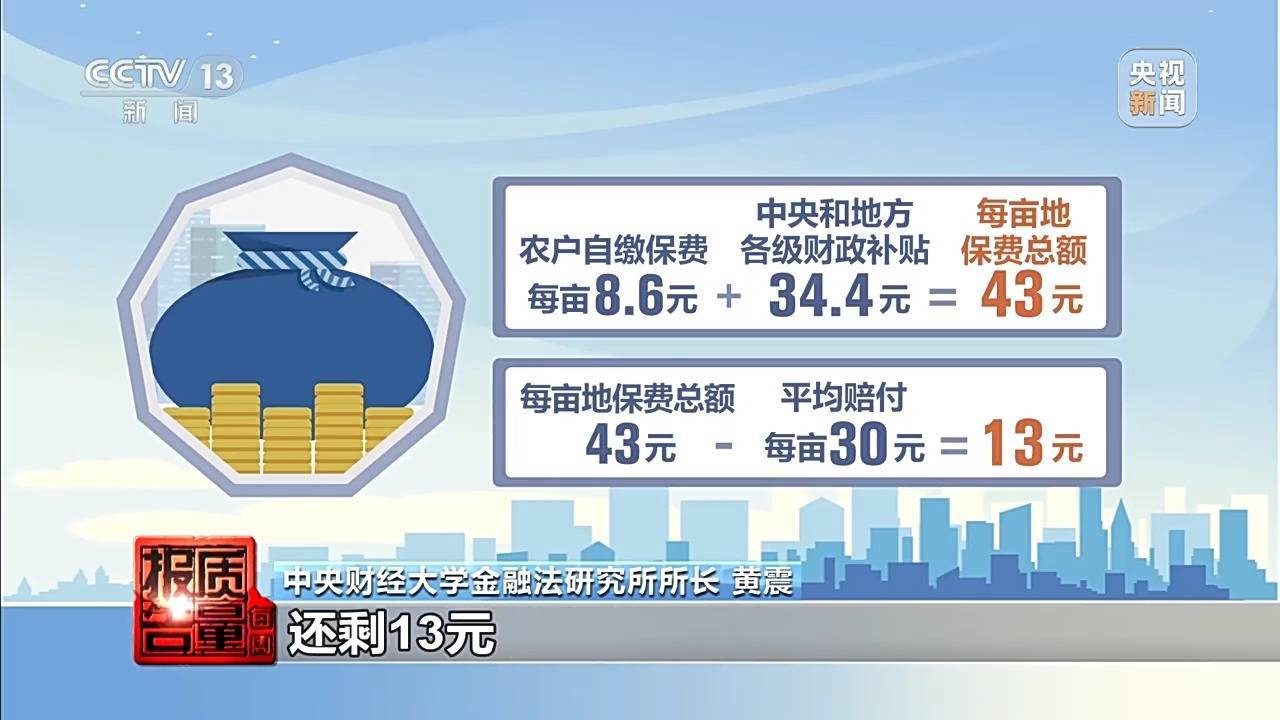 中央财经大学金融法磋商所长处 黄震:每个农户一亩地玉米缴8.6元保费,因为是平均赔付,是以每个农户一亩地不错赔30元,乍一看能够还差21.4元,但执行上保费是农户的8.6元,加上中央和地方各级财政补贴的34.4元组成的,每亩地保费总和是43元。是以对保障公司来说,即即是平均赔付30元,还剩13元。