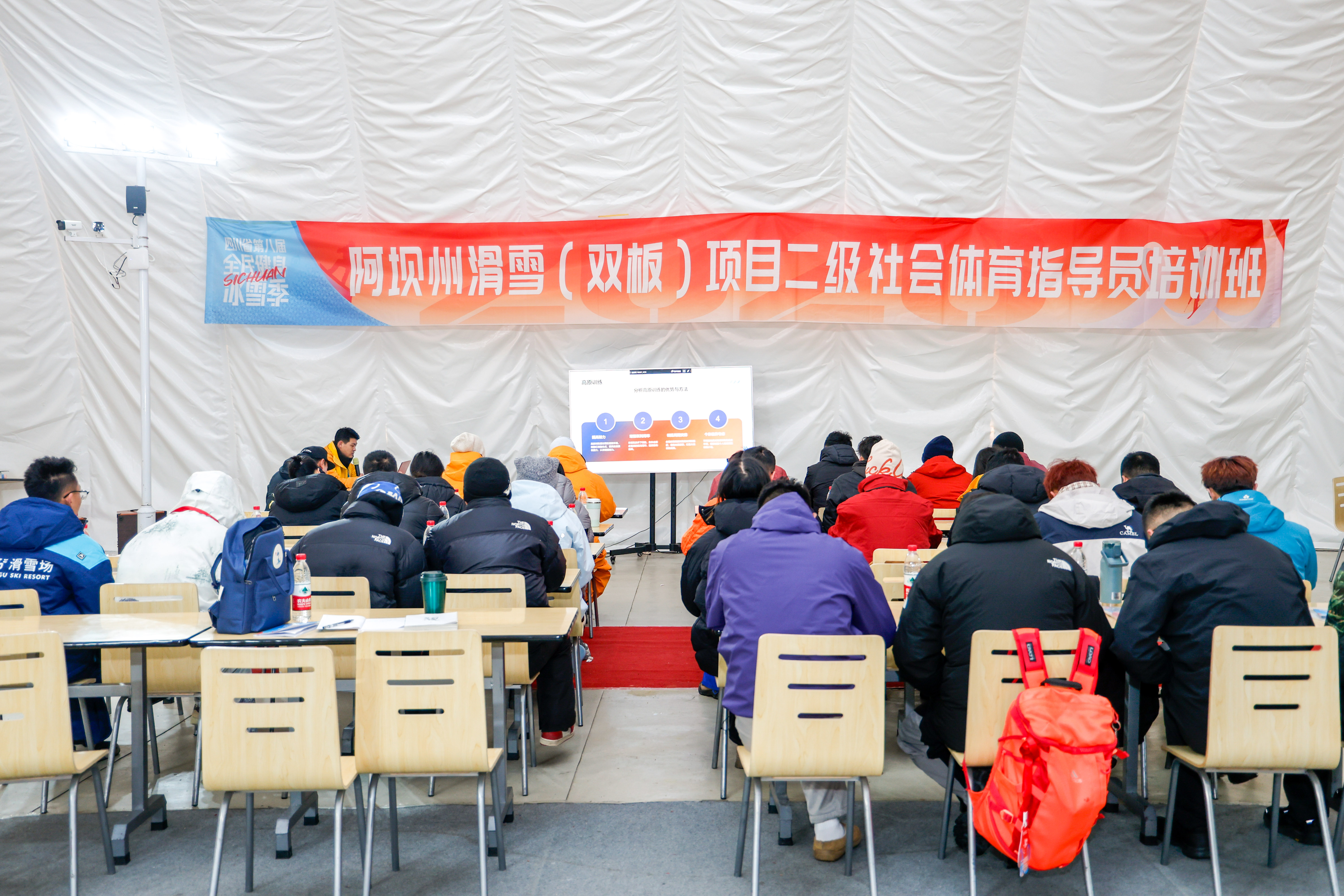 1月28日,四川省第八届全民健身冰雪季阿坝州滑雪(双板)容貌二级社会体育设备员培训班,在理县孟屯河谷滑雪场开班。当地40余名滑雪嗜好者皆聚一堂,系统治受表面与实操培训。